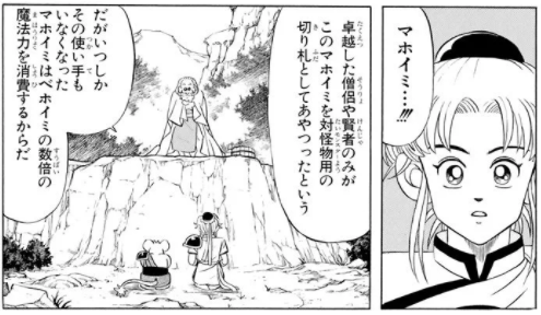 おなじみの回復呪文「ホイミ」の効果を究極にまで高めた呪文。回復呪文でありながら、相手を過剰に回復させることで生体組織を破壊する恐ろしい魔法です。ベホイミの数倍の魔法力を要するため、いつしか使用者もいなくなった古の魔法。拳聖ブロキーナが武神流拳法と併用することで同じ効果を得る極意「閃華裂光拳」をあみだした。
