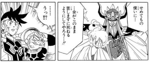 竜の騎士のみが使える最強の呪文。ダイやその父バランが使用し、竜の騎士のみが持つ竜闘気(ドラゴニック・オーラ)を手に圧縮して放つ呪文。呪文と闘気の合体魔法になり、威力は絶大で、作中では半島を丸ごと消滅させました。圧倒的な威力の反面、使用者への反動も大きく、竜魔人化しないと手が吹き飛ぶとされており、物語終盤まで純血の竜の騎士であるバランしか使用できなかった。メドローアと並ぶ最強呪文。