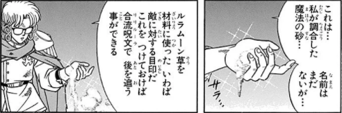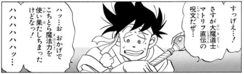 作中ではアバンとポップが使用しましたが、ポップの場合は砕いたマジカルブースターの魔法石で小さな五芒星を描き、全魔法力を投じることで発動させることができましたが、正式に取得できているわけではなく、マグレ技と本人も認めている。アバンも賢者ではないが、使用者本人が特別製のため使用可能。